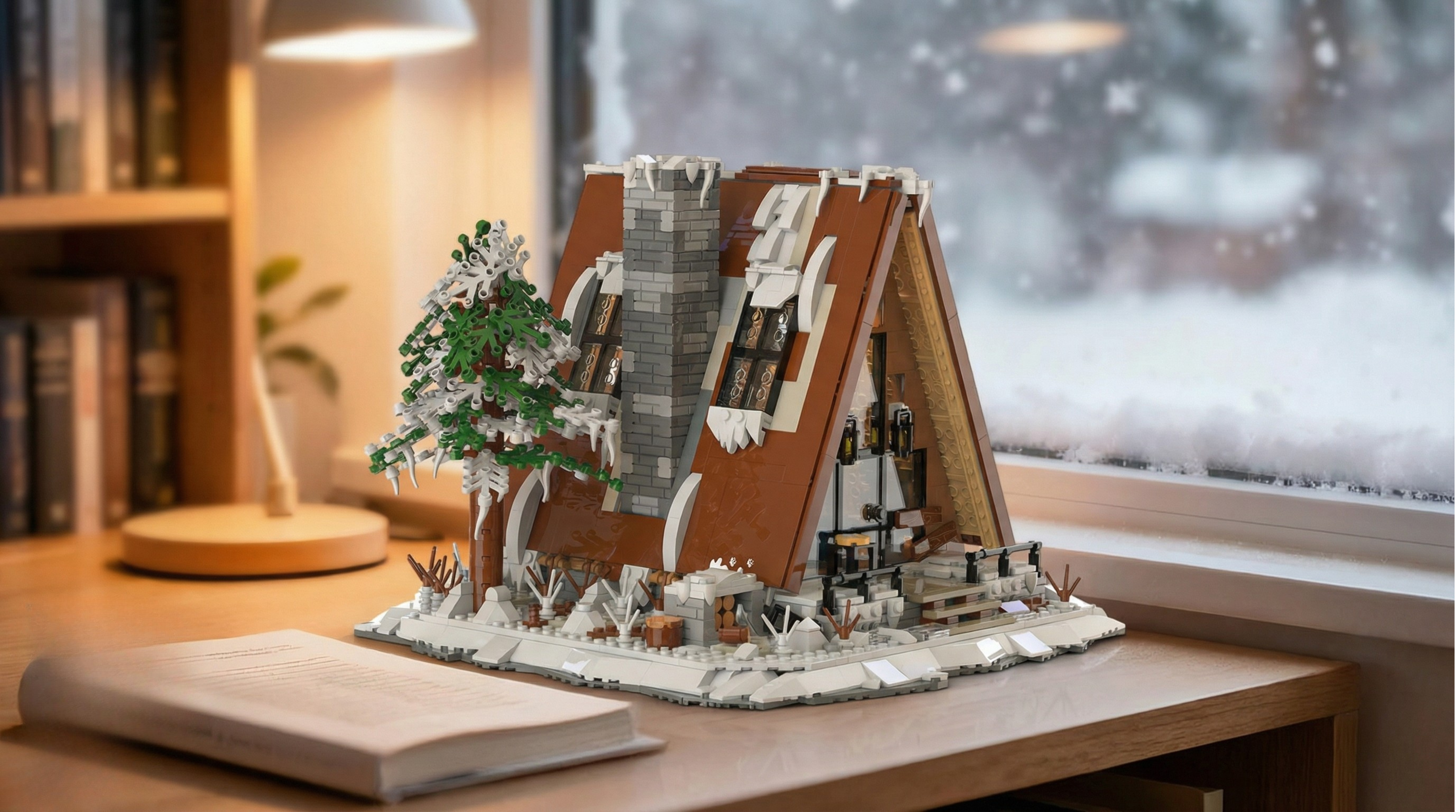A-Frame Snow Cabin features detailed snowy design, furnished interior, LED lights and removable roof, perfect for building fans and winter home decoration.