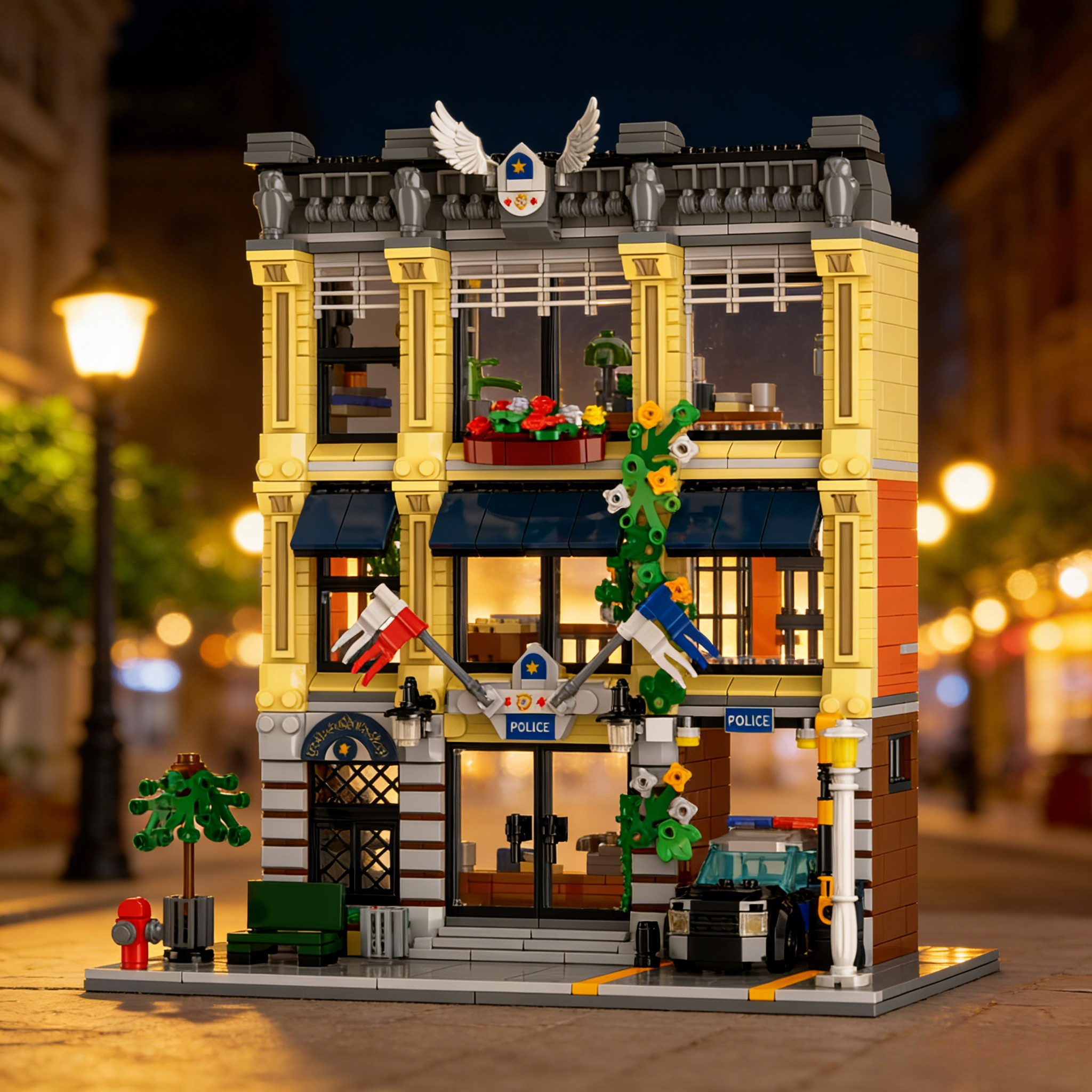 Its cream-and-terracotta facade tangles with ivy and tiny yellow blooms, capped by ornate roof trim, statues, and a bold winged police badge. A flower-filled window box softens the edges, while the sidewalk below holds a weathered bench, red fire hydrant, and a patrol car tucked in a bay—all primed to glow after dark, courtesy of the included light kit.Step inside, and each floor unfolds a dense, lived-in slice of precinct life: