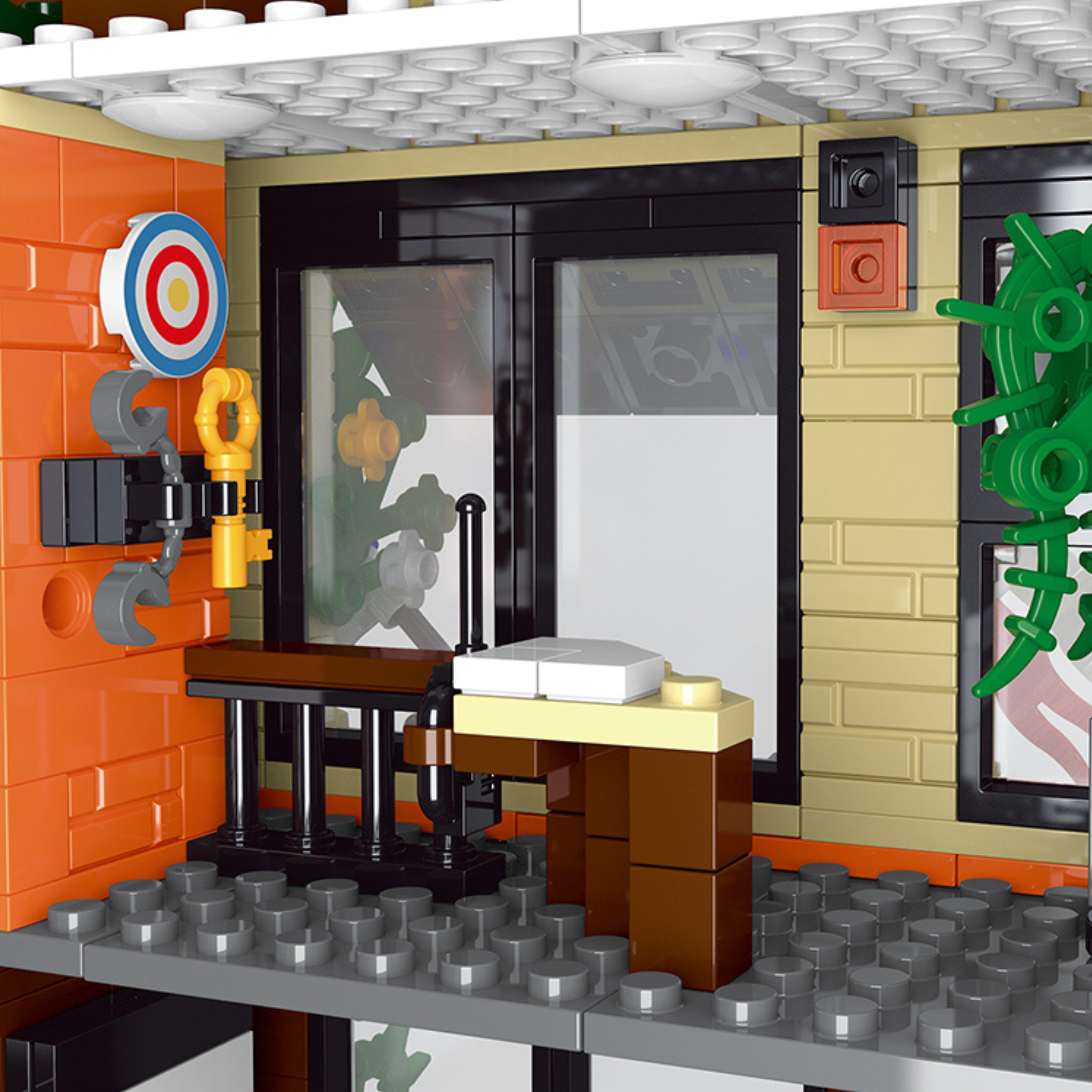 Equal parts utility and personality. A steel-barred cell holds a yellow mug and basin, a surprisingly human detail. Nearby, a terracotta wall displays a target board, paired with cuffs and a giant key; files stack on a counter, and ivy drapes the window—this is where patrols prep and grab quick breaks.