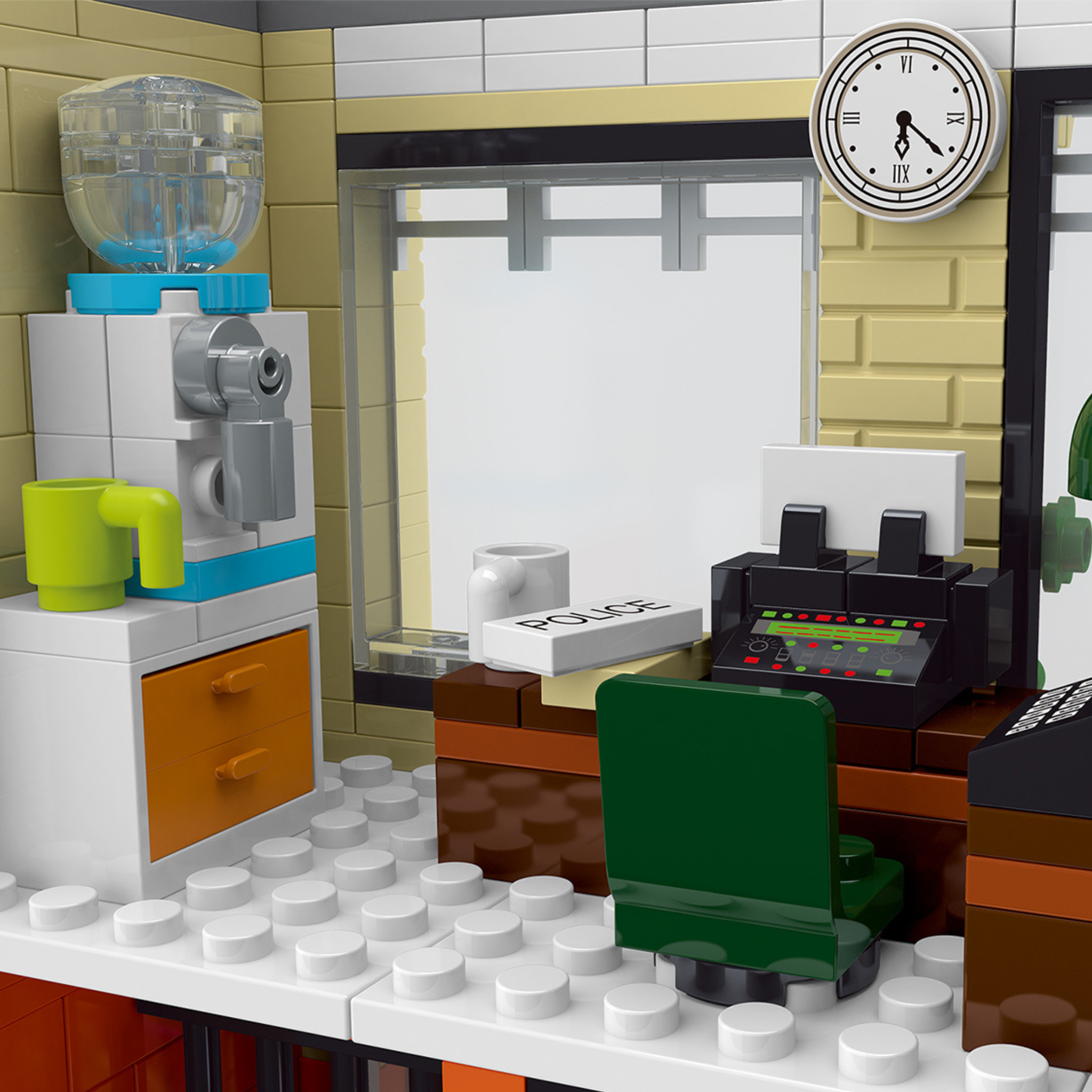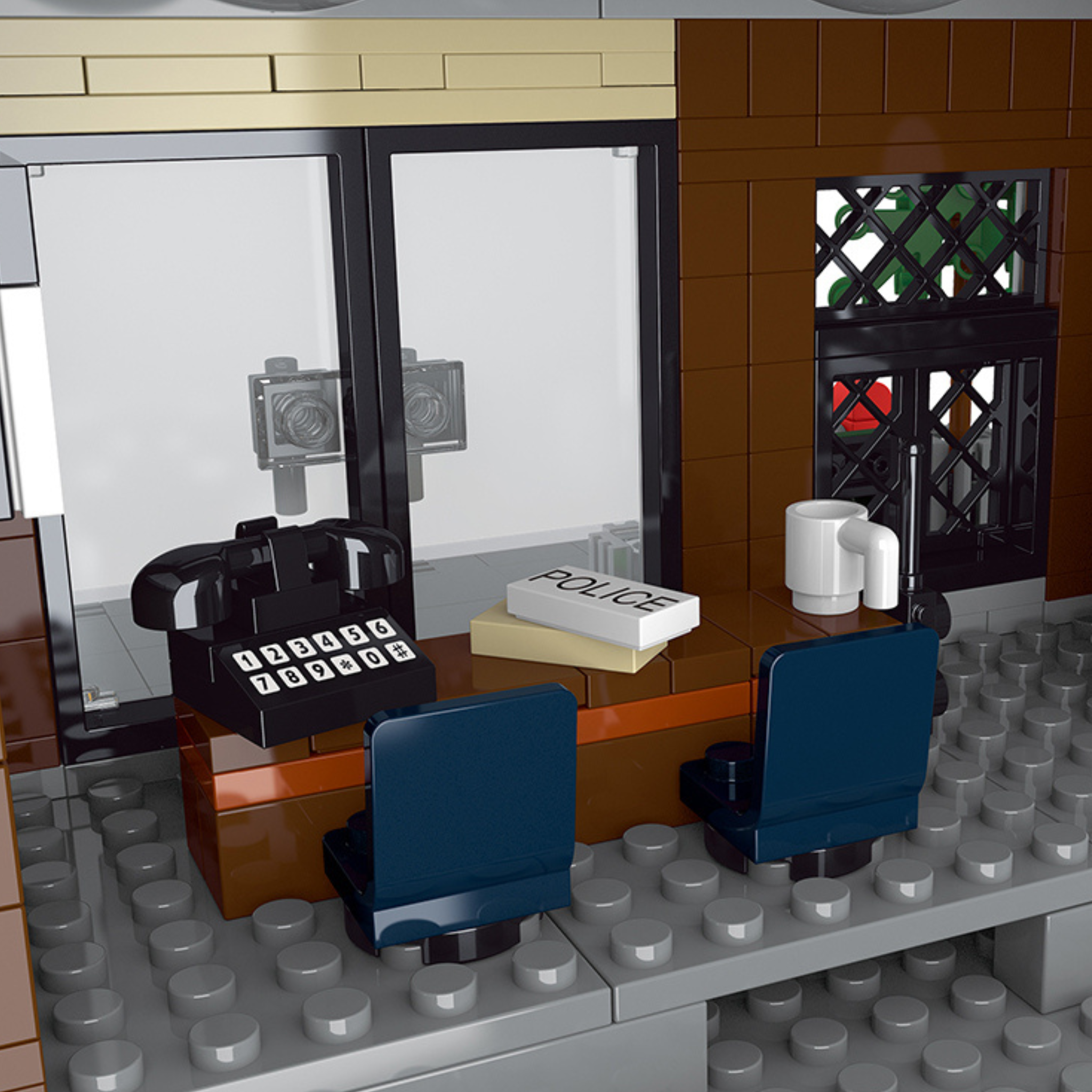 The station’s heart. A push-button phone, “POLICE” notepad, and half-full mug rest on the desk; two blue chairs face it (for witnesses), and a water cooler stands close by. The patrol car bay peeks through a side door, capturing the precinct’s constant comings and goings.