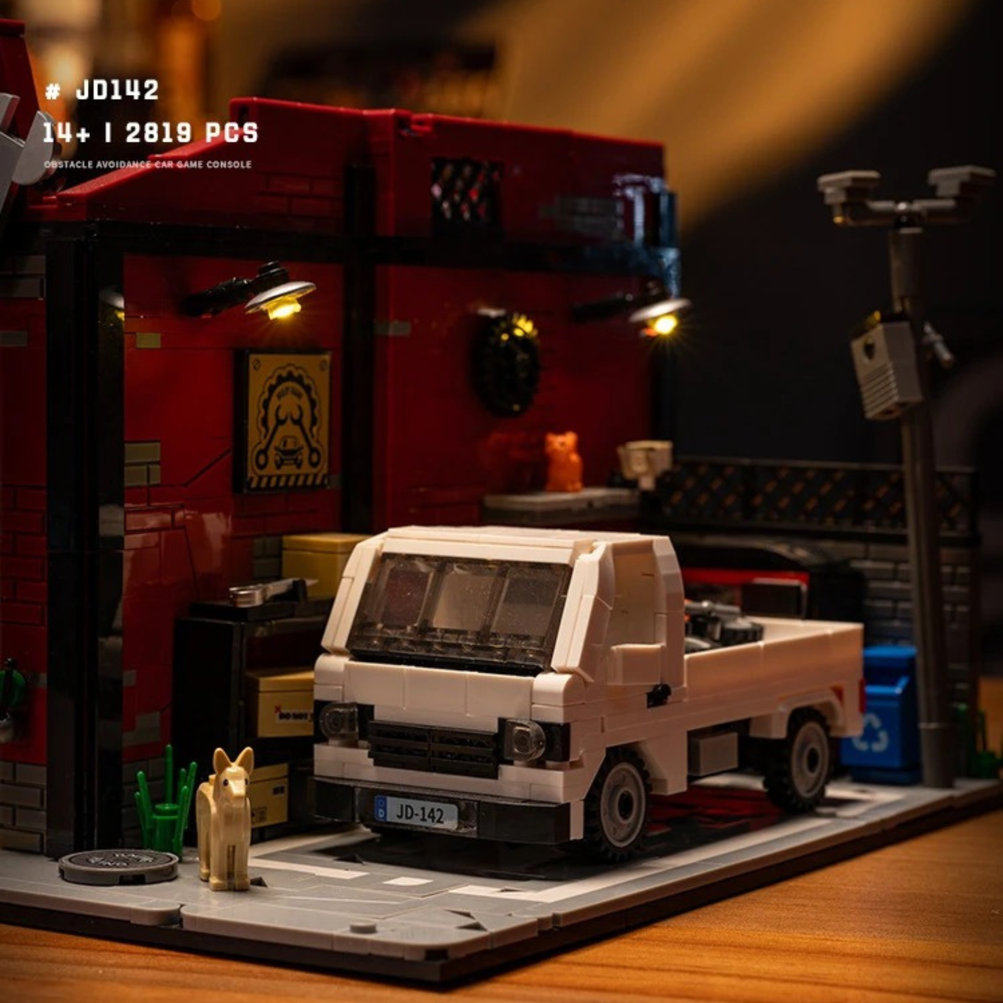 Beyond the facade, the magic unfolds inside. The shop’s modular layout lets you peel back walls to reveal a fully functional workshop: a working hydraulic car lift stands ready to hoist your favorite rides. A wall of gold-rimmed wheels and suspension parts nods to the era’s hot-rod culture, while a cluttered workbench holds a mini laptop and oil cans that add a layer of realism. To the right of the main service area, a dedicated garage bay is sized perfectly for eight-stud cars—park your collection, line up project vehicles, or show off custom builds for a display that truly captures the bustle of a retro auto shop. Even the smallest touches, like a “Project Services” sign advertising ECU tuning and performance upgrades, tie the build to the world of car modification, making it a playground for gearheads.