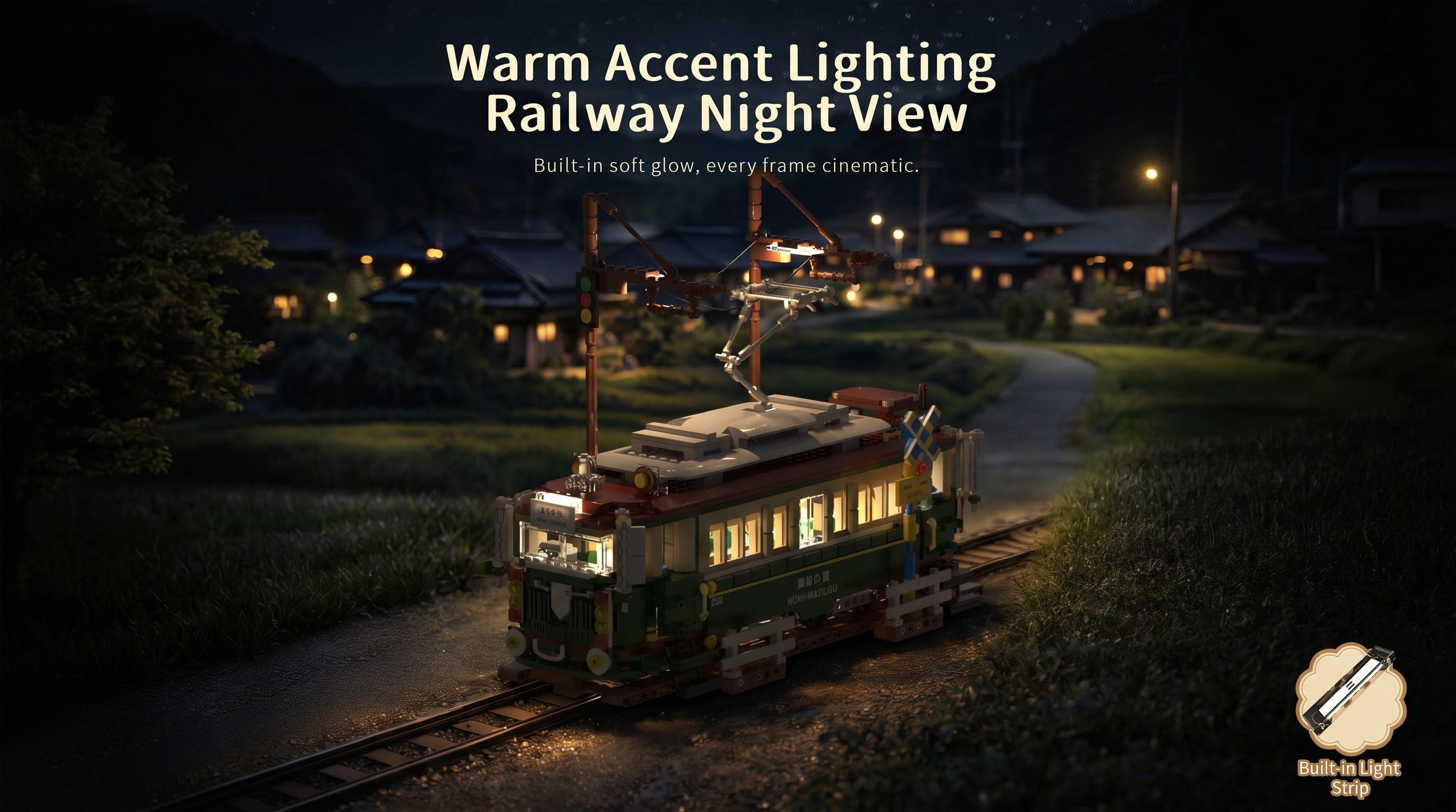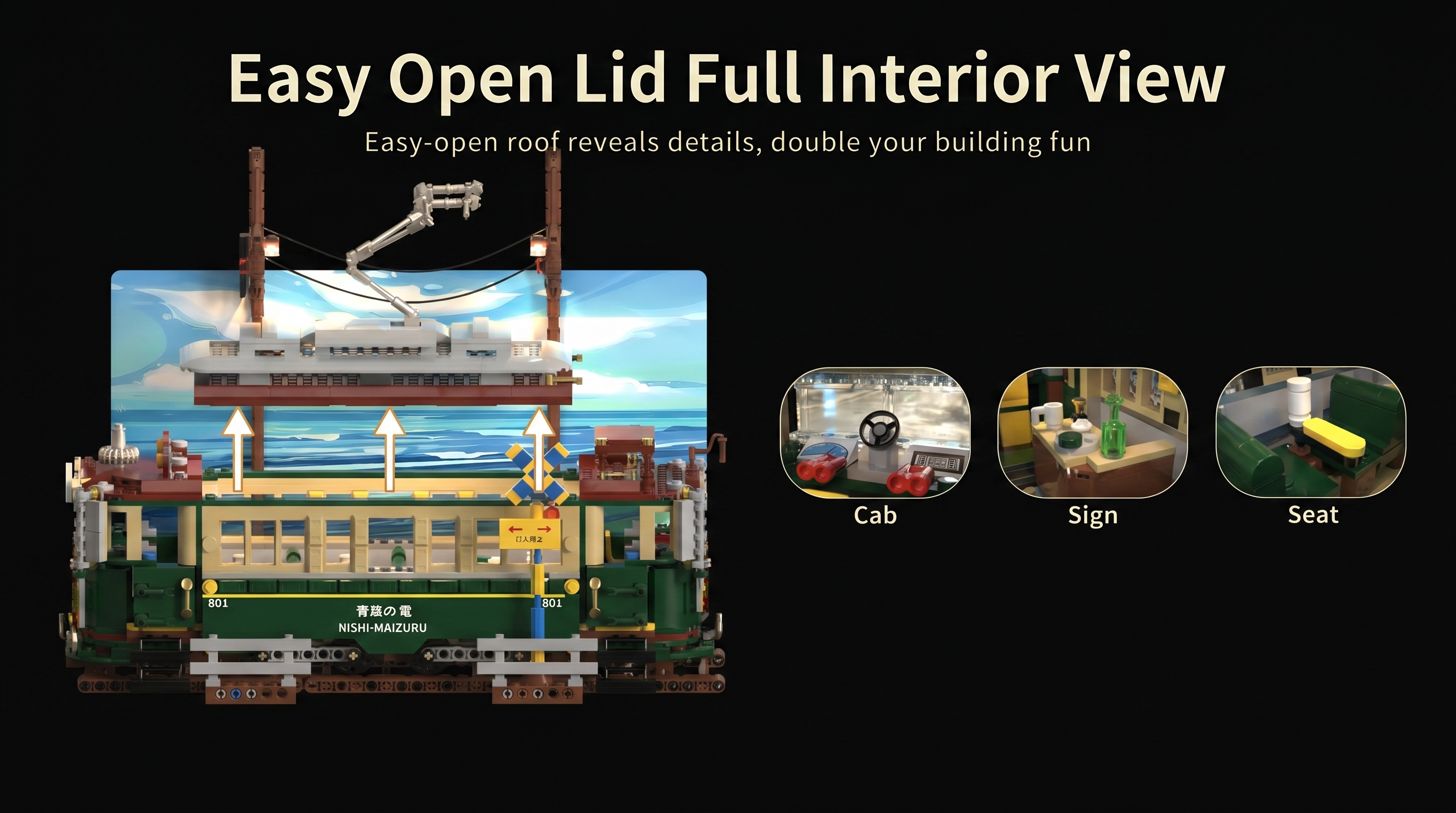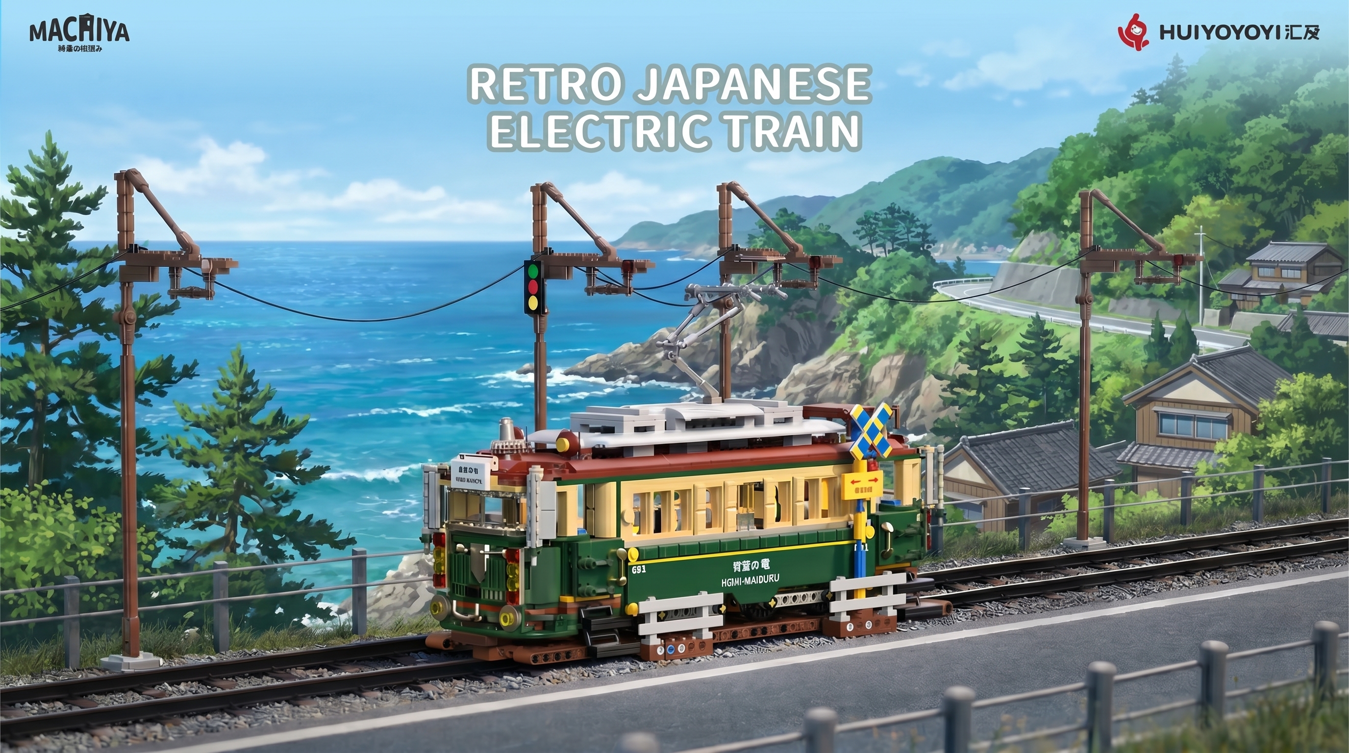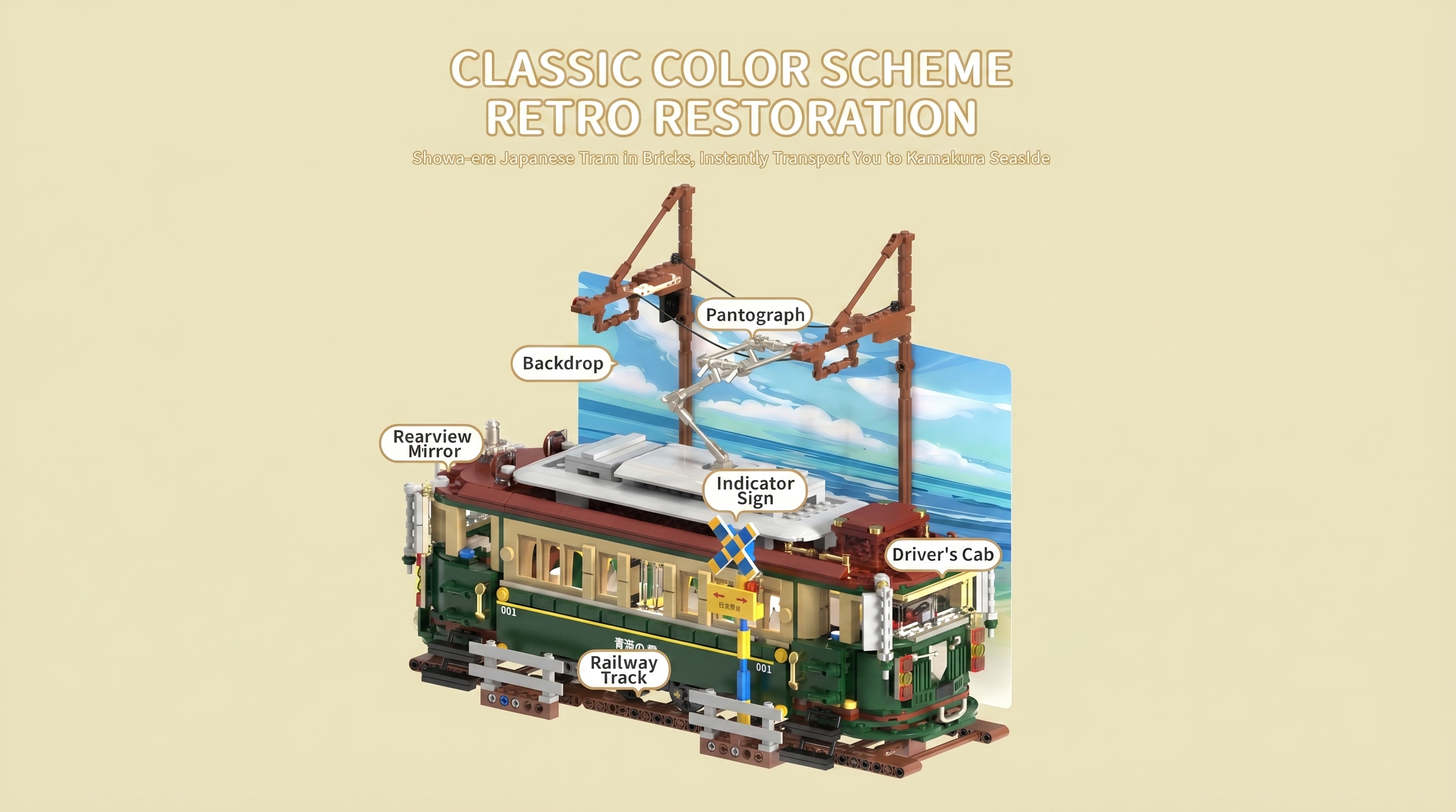 Crafted with a faithful classic color scheme, the tram’s deep forest green body, cream accents, and rust-red roof pay homage to the iconic 601-series streetcars that once cruised the coast. The set is packed with authentic details that bring the era to life: a functional pantograph that reaches for overhead wires, a tiny indicator sign marked with Japanese characters, and a side panel emblazoned with “青葉の電 NISHI-MAIZURU” to mirror real-world rolling stock. Even the included railway track, complete with a working crossing signal and traffic light, grounds the build in its coastal setting, while the scenic backdrop lets you stage your very own Kamakura Seaside scene at home.