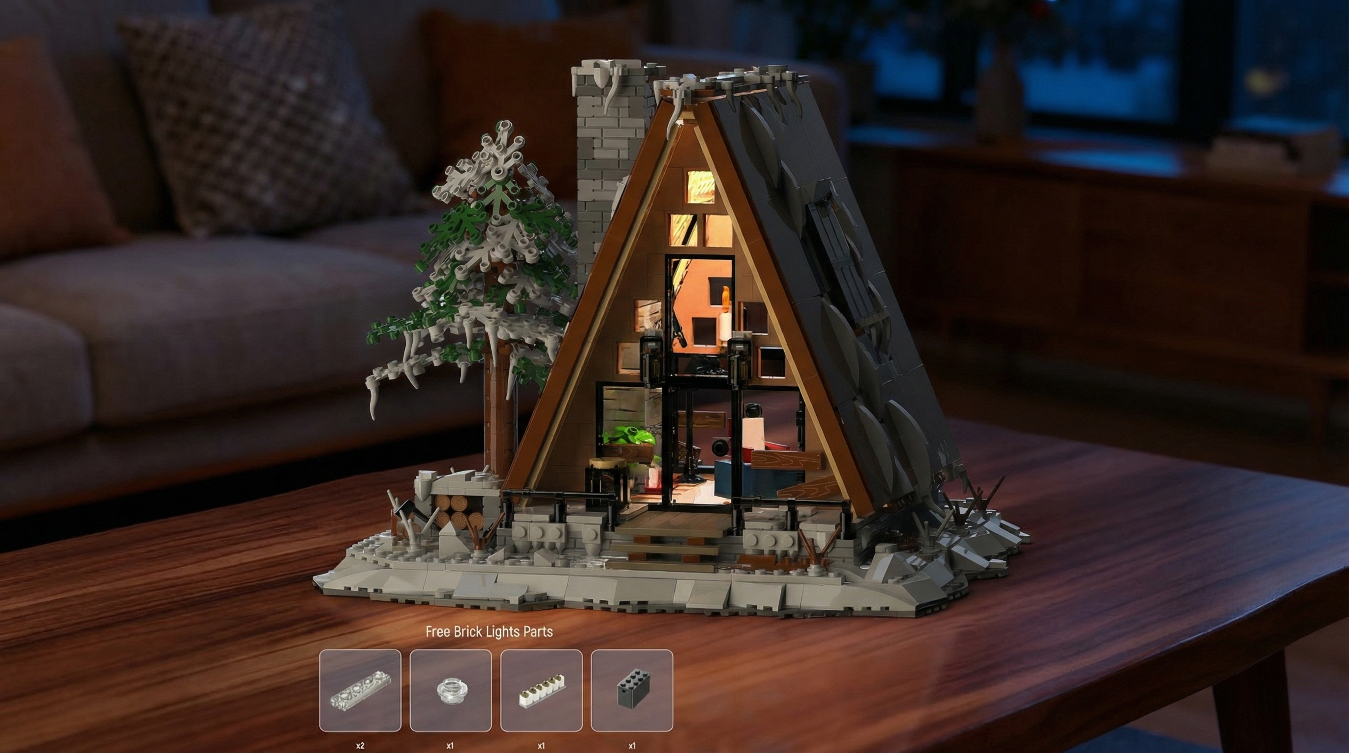 Unlike ordinary display models, this A-Frame Snow Cabin boasts a fully furnished interior that’s visible through its large, transparent glass front. Step beyond the exterior, and you’ll discover a thoughtfully designed living space that feels warm and lived-in. At the heart of the interior is a realistic fireplace with a faux stone interior and a tiny fire detail, flanked by stacked miniature firewood beside the chimney—adding an authentic touch of rustic charm. The space is furnished with small, wooden-style pieces: a compact table, two chairs, and a cozy bench, all crafted with intricate detailing to match the cabin’s rustic aesthetic. The set also includes free brick LED light parts, allowing you to cast a soft, warm glow throughout the interior and transform the cabin from a daytime display into a glowing night-time centerpiece.