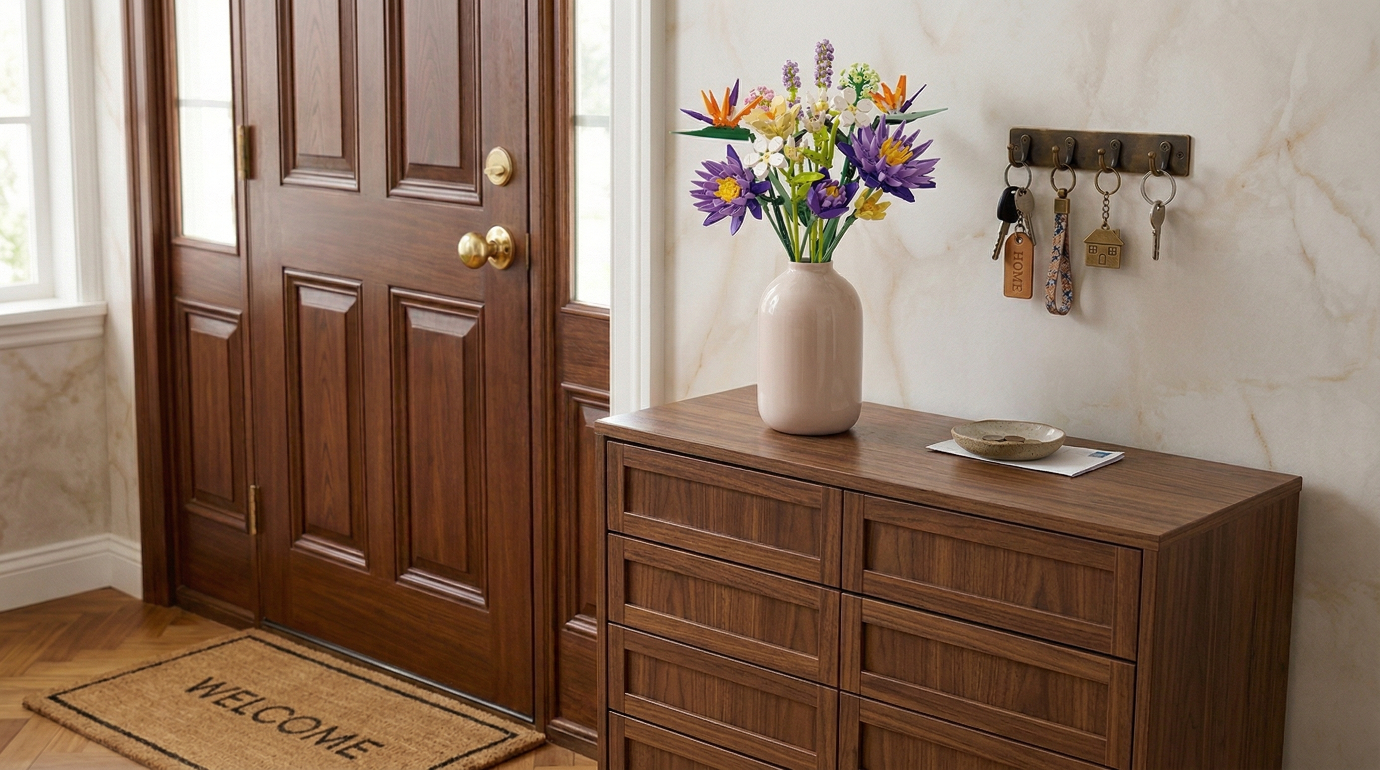The Entryway: Your foyer sets the tone for your home. While fresh flowers are lovely, they are fleeting. For an effortless, avant-garde approach, try styling your entryway credenza with "forever botanicals," like the Tropical Flower Bouquet or the Dream Infused Flower Garden. Placed under a soft spotlight, the geometric petals cast stunning, dappled shadows. It’s a warm, creative welcome that never wilts—and requires absolutely zero maintenance.