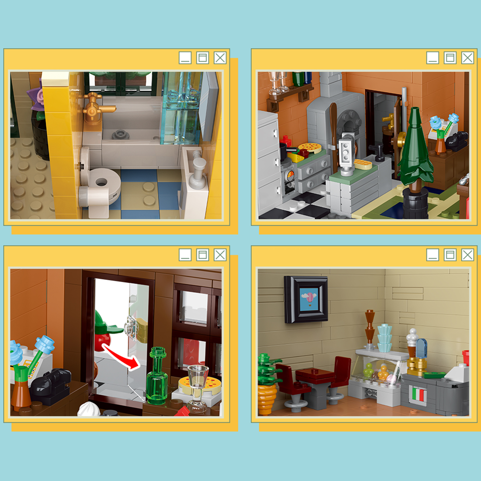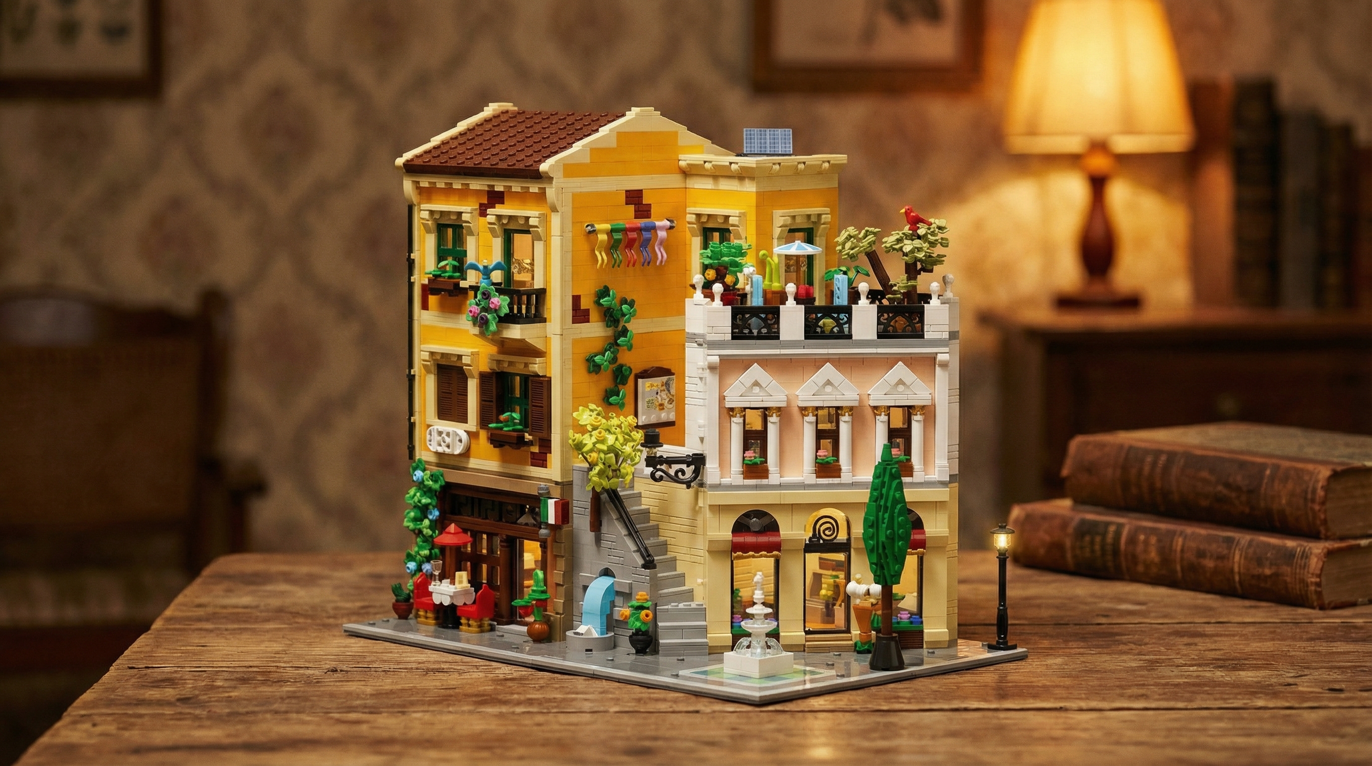 What truly makes The Rome Corner Shop unforgettable is its devotion to the little things. Colorful laundry flutters gently on a line, a tiny bird rests on the balcony, and a soft streetlamp casts a warm glow—details that turn a static display into something alive. With the included light kit, the whole building glows softly at night, turning the model into a warm, welcoming scene that feels almost real.
