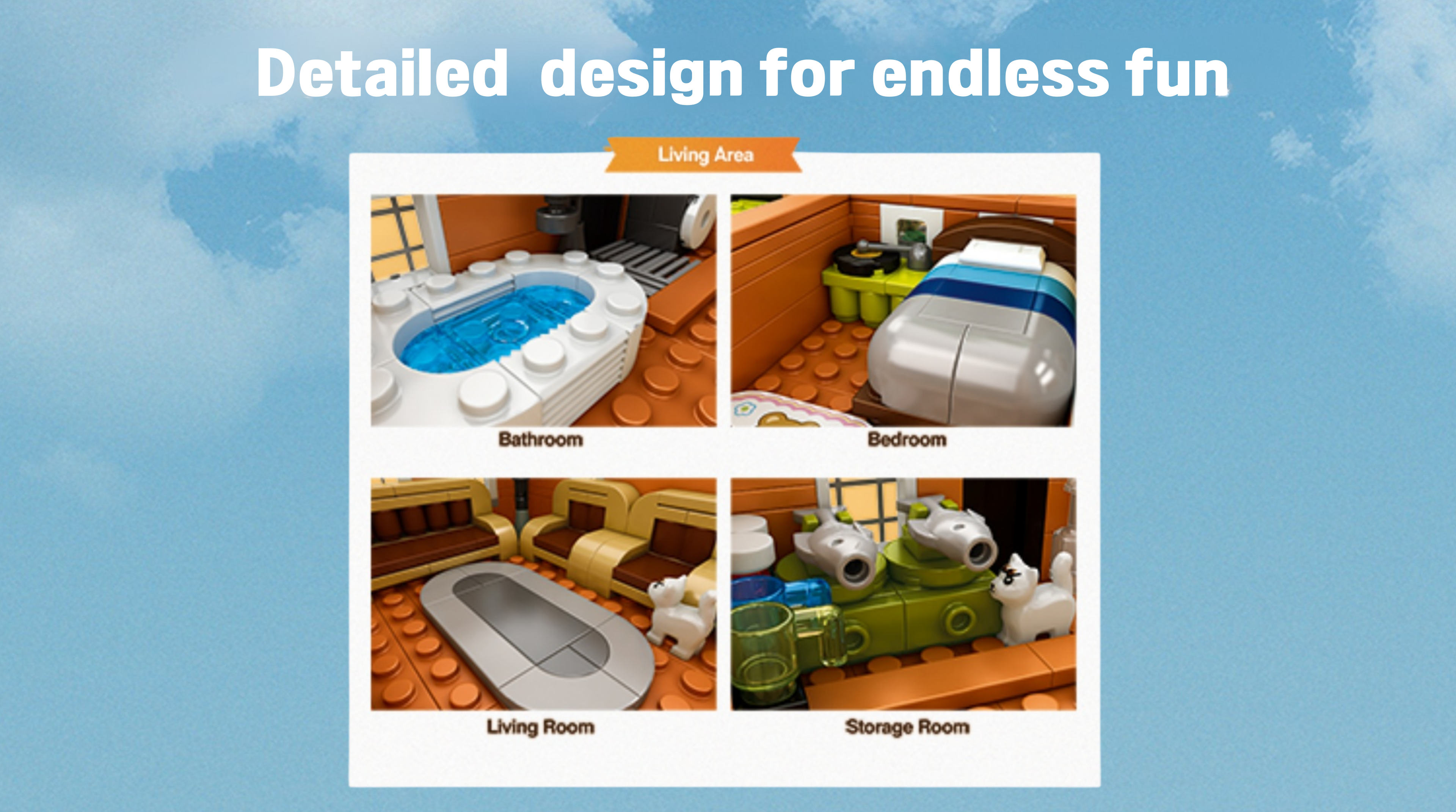 Lift the roof of the connected cottage, and you’ll discover a fully furnished interior that turns this model into a tiny, livable world. The baking kitchen is a feast for the eyes: two stone mills grind imaginary grain, a bread-making station holds loaves and rolling pins, and shelves brim with colorful cupcakes and pastries. Next door, the living area unfolds into a cozy bathroom with a blue-tiled tub, a plush bedroom with striped bedding, a sunken living room with sofas, and a storage room stacked with jars and cute white cat figurines.