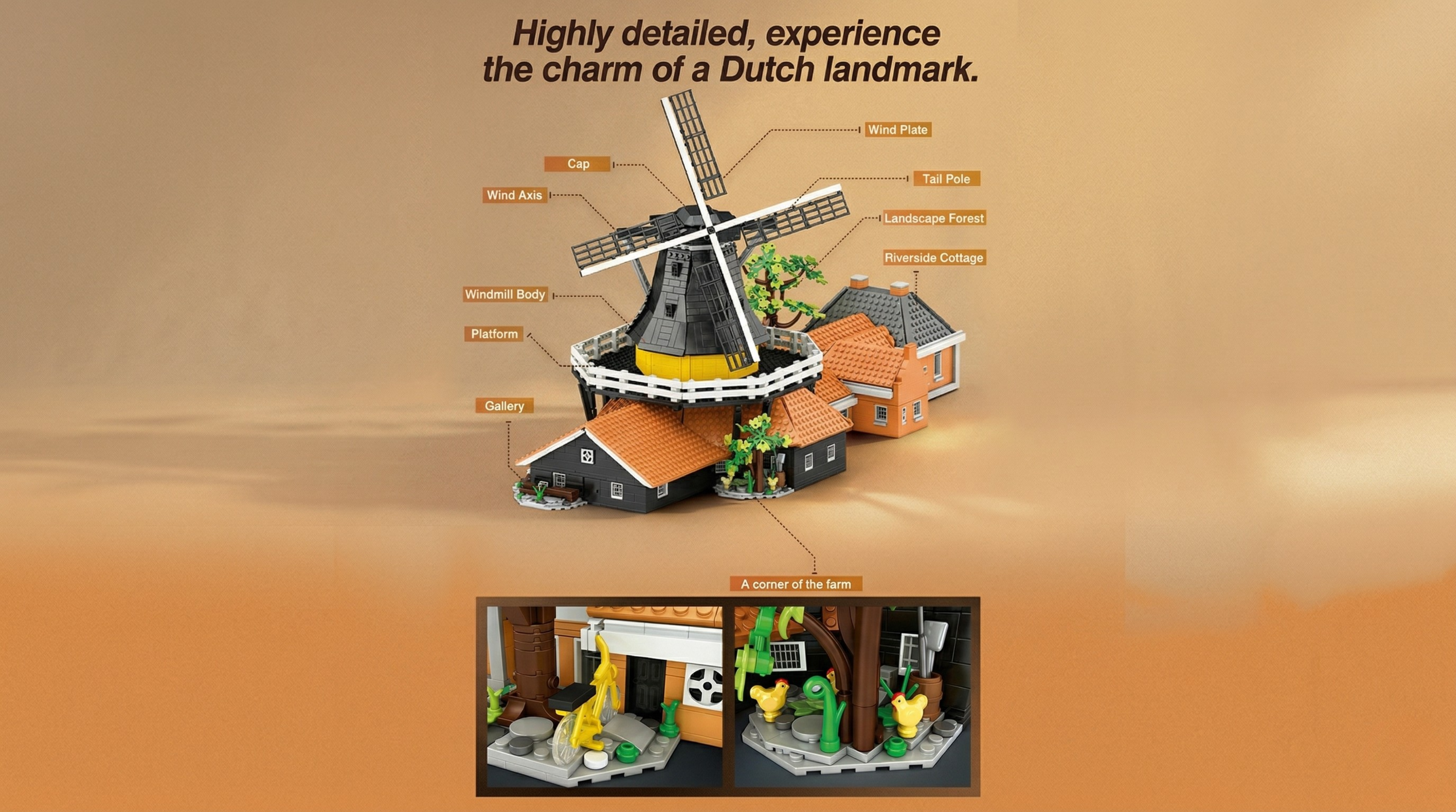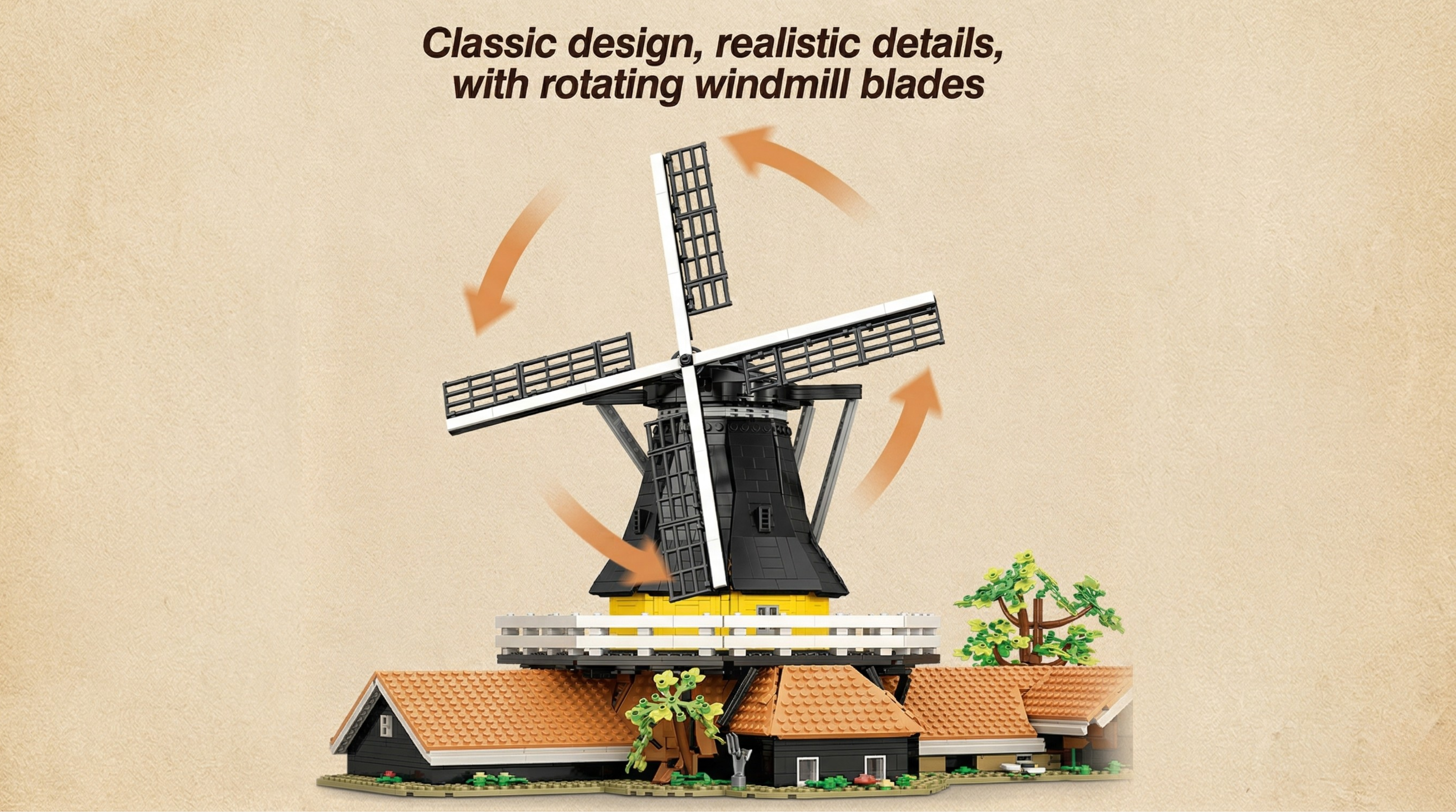 This windmill isn’t just plastic bricks and printed pieces — it’s a little slice of the Dutch countryside you can hold in your hands. When you finish the last brick and spin those wind blades for the first time, you’re not just admiring a model; you’re stepping into a story: the miller checking the sails at dawn, the baker pulling warm loaves from the oven, the chickens clucking in the yard as the water laps at the canal edge.